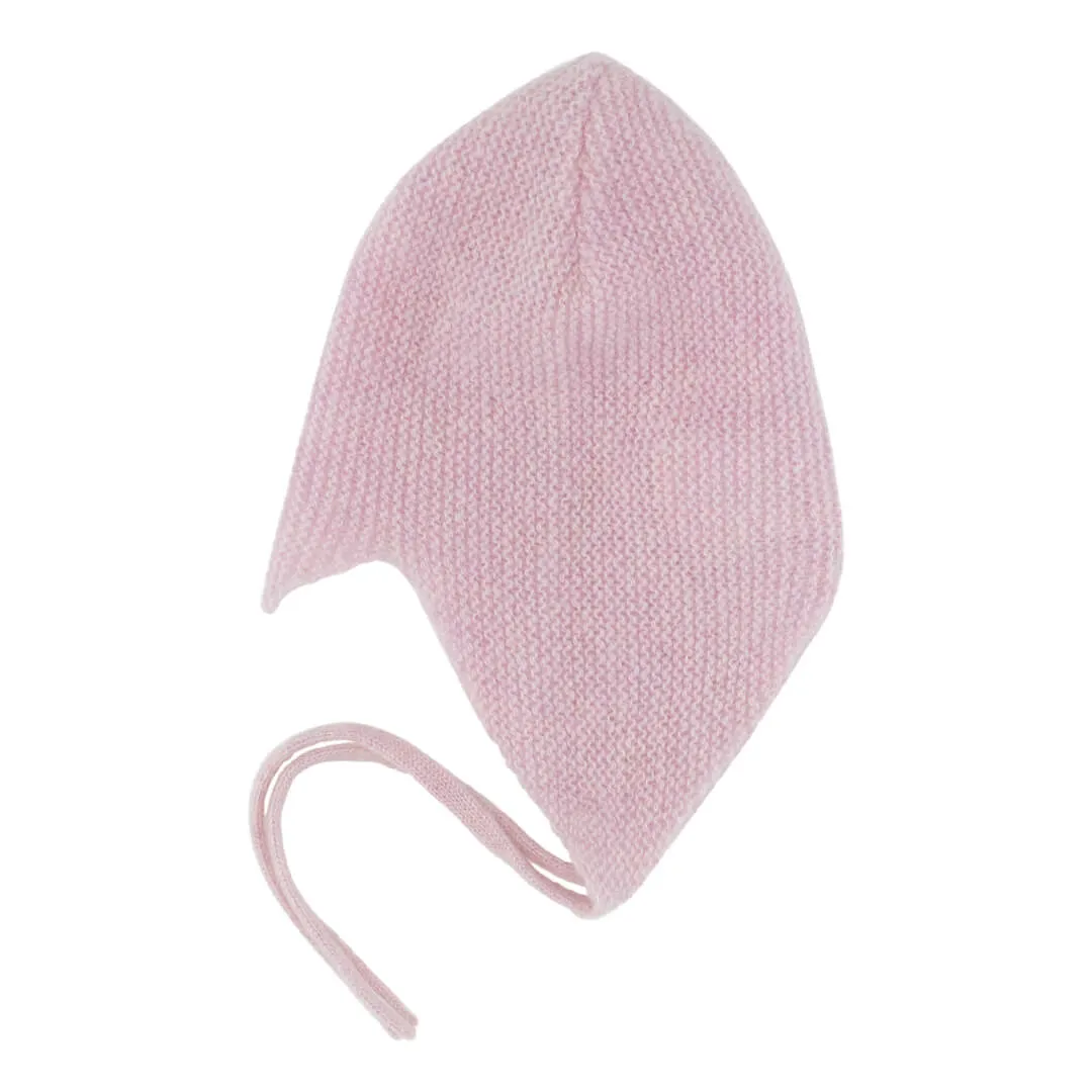 Baby djævlehue med bindebånd i lyserød. Blød, varm, lækker hue, der er behagelig at have. 100% cashmere. Vaskes på et uldprogram på maks 30 grader, og med en uldsæbe.