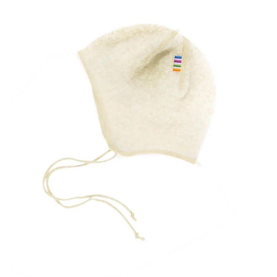 Hjelm med bindbånd. Enkelt lags. God pasform. En kraftigere børstet uldkvalitet som er ekstra blød og lækker. Naturhvid. Pure merino wool ogOeko-tex 100 mærket.
