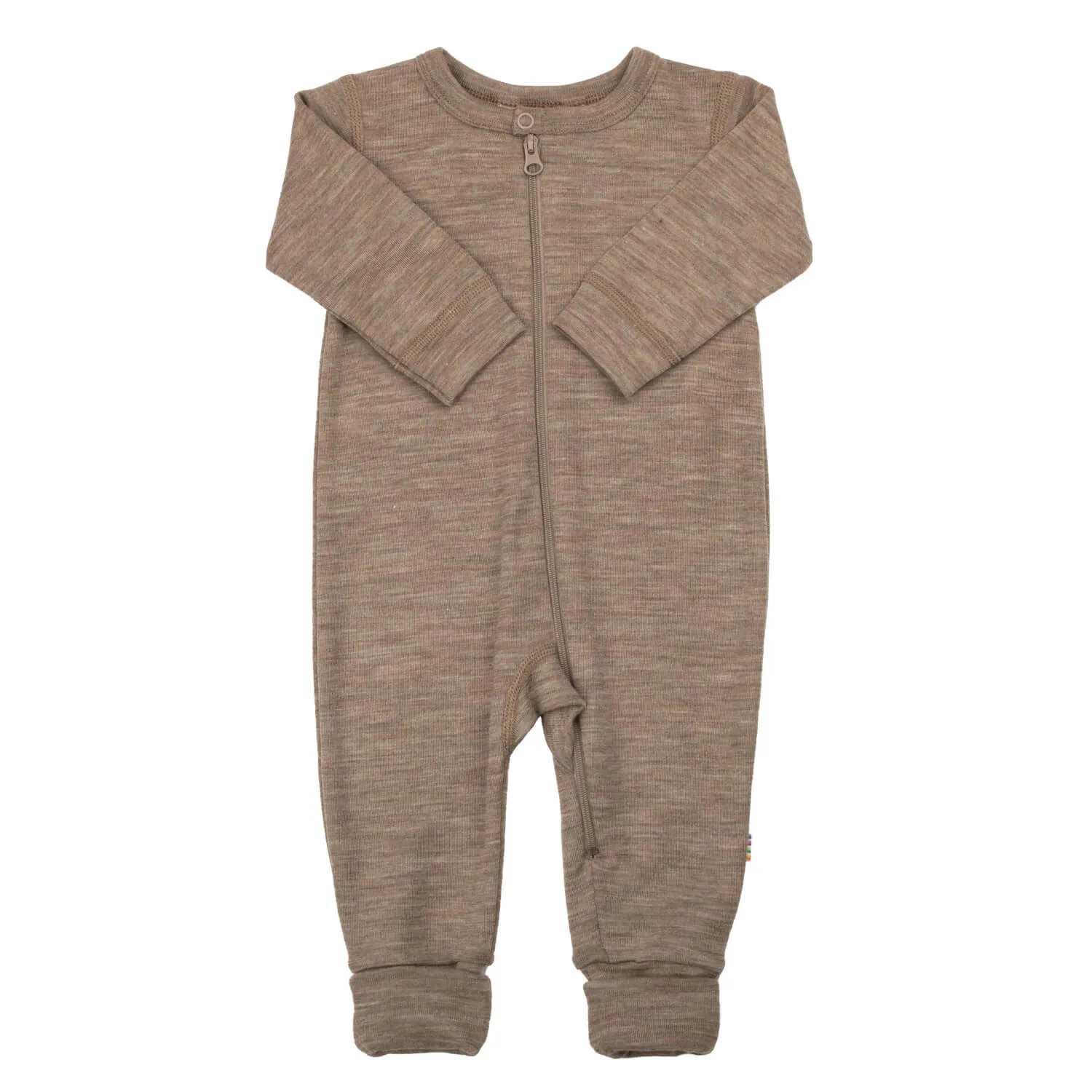 Heldragt med 2 i 1 fod. Lukkes med en trykknap ved halsen samt lynlås som går ned i det ene ben for nemmere påklædning. En pæn, glat og elastisk uld kvalitet med silke. Meleret stof. Wool rich blend og Oeko-tex 100 mærket.
