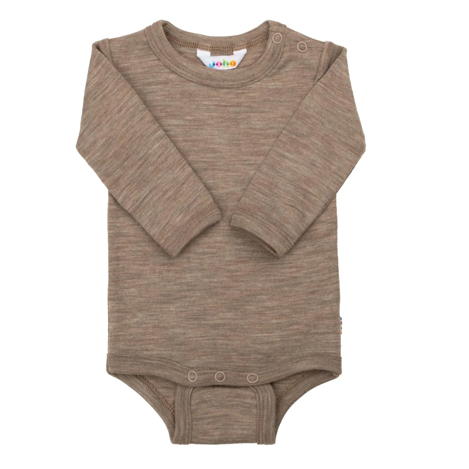 Joha uld-silke langærmet body i beige melange. Den har fine trykknapper ved skulderen og for neden som gør den super nem at få af og på. Den er lavet i den blødeste merinould-silke blanding, der ikke kradser. Merinould er tyndere og blødere end almindelig uld – og dit barn kan bruge denne body året rundt. Uld giver en langt større velvære end almindelig bomuld – så dette er en investering i dit barns velvære.  Hos Scandinavianlux har vi et stort udvalg af uld-silke tøj til børn, i den blødeste kvalitet.