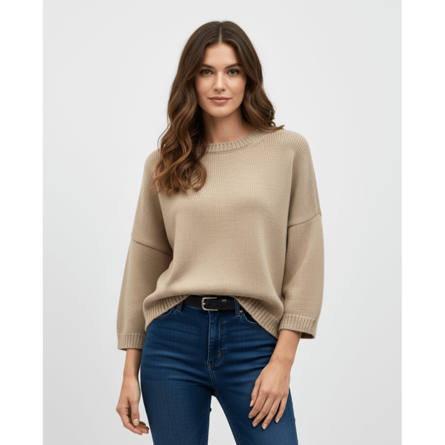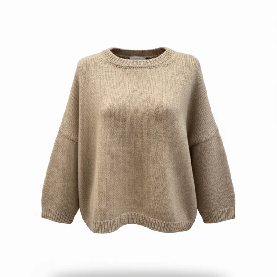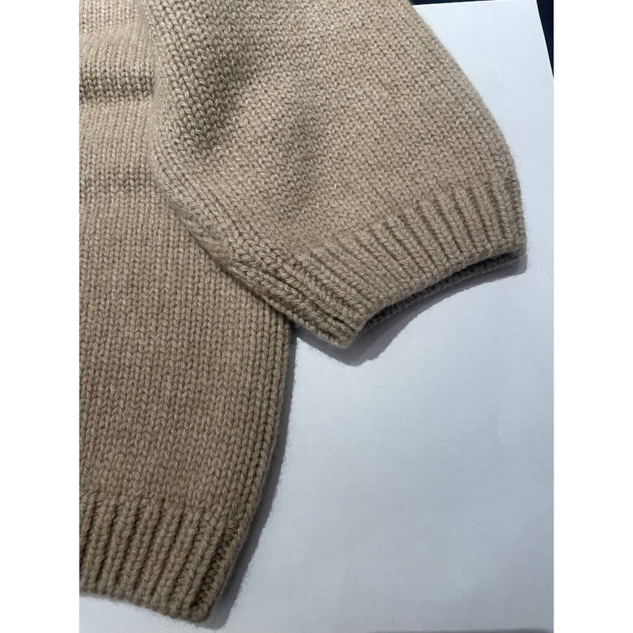 Dejlig varm og blød cashmere-uld sweater, i lys beige. Vaskes nemt i maskinen på 30℃ uldprogram, med en skånsom uldsæbe.
