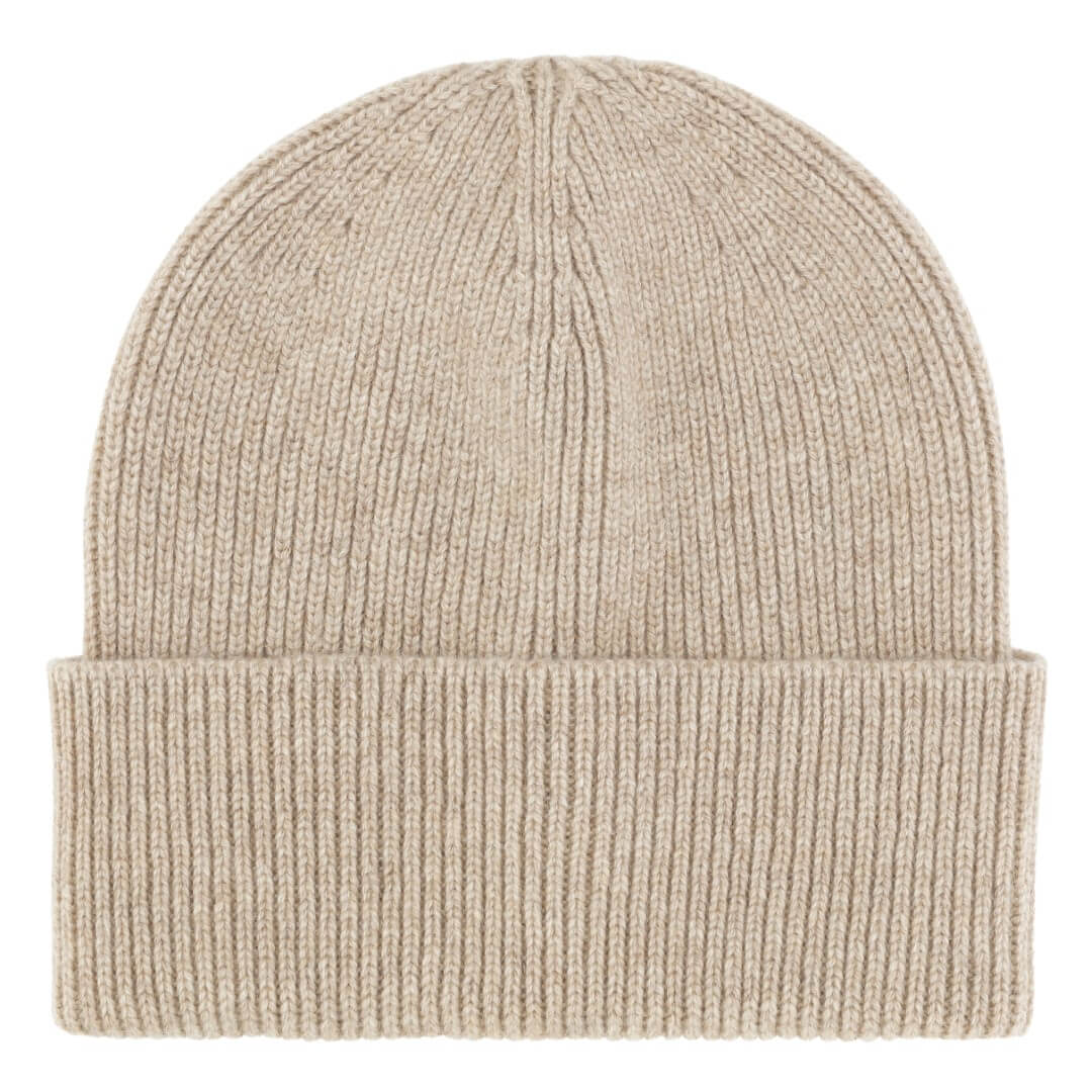 Cashmere rib hue i lys beige. Huer i cashmere til kvinder er langt blødere end nogen andre huer. Cashmere ulden er den fineste uld i tøj og tilbehør, og er derfor rigtig behagelig og lækkert at have på.