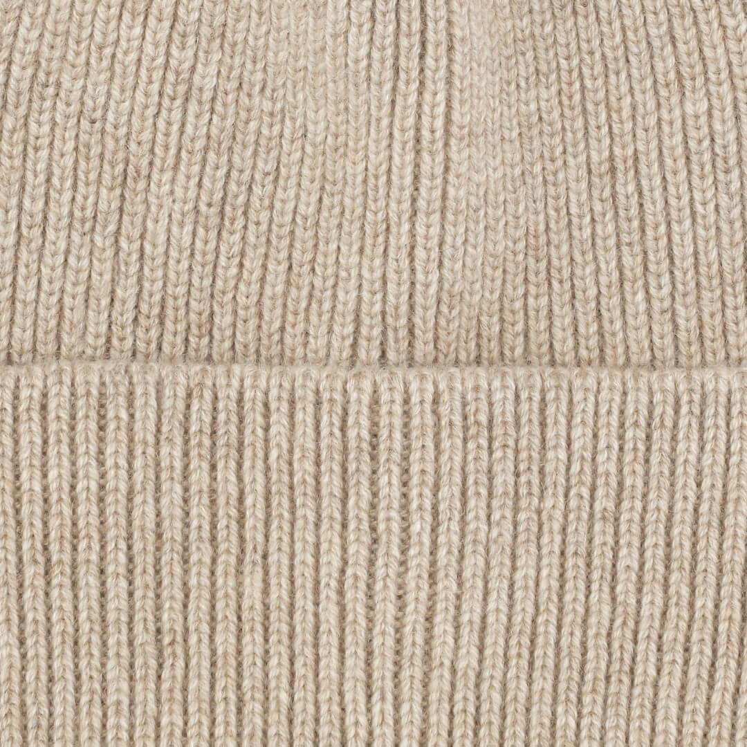 Dejlig varm og blød cashmere hue i rib. Lys beige. Vaskes nemt i maskinen på 30℃ uldprogram, med en skånsom uldsæbe.