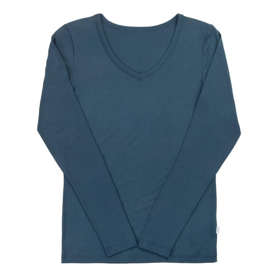Bluse med lange ærmer. V-hals. En ekstra blød økologisk bambus kvalitet som er meget elastisk. Kvalitetens strækevne og blødhed gør at den er dejlig at have på. Ensfarvet. Oeko-tex 100 mærket.
