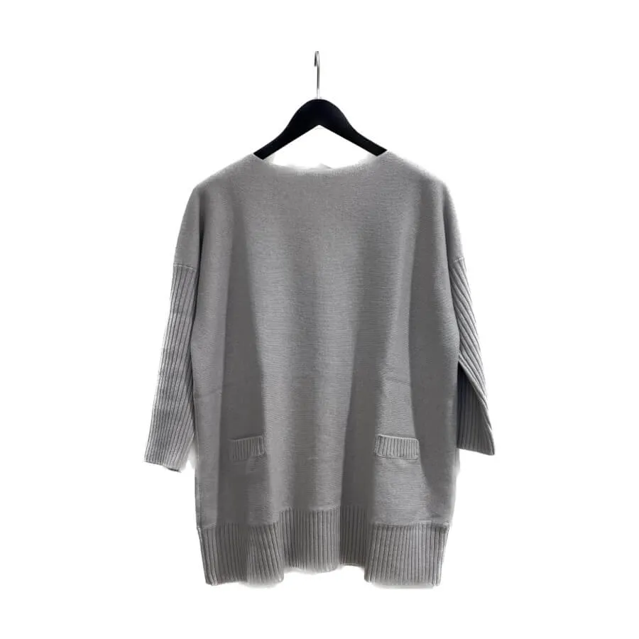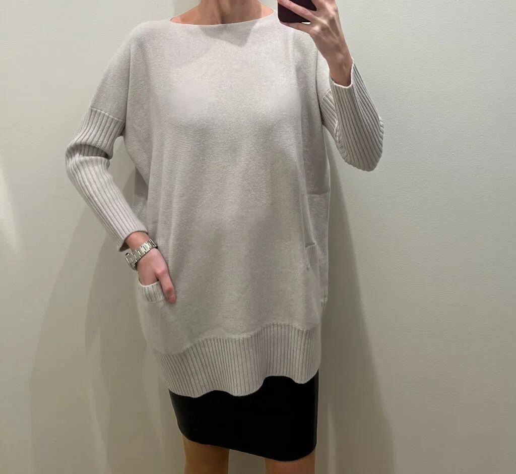 Scandinavianlux oversize cashmere sweater med rib-ærmer lysegrå. To lommer på fronten af blusen. 100% cashmere.