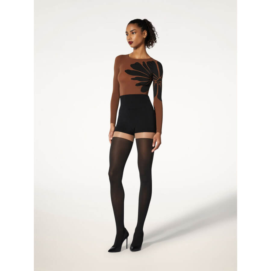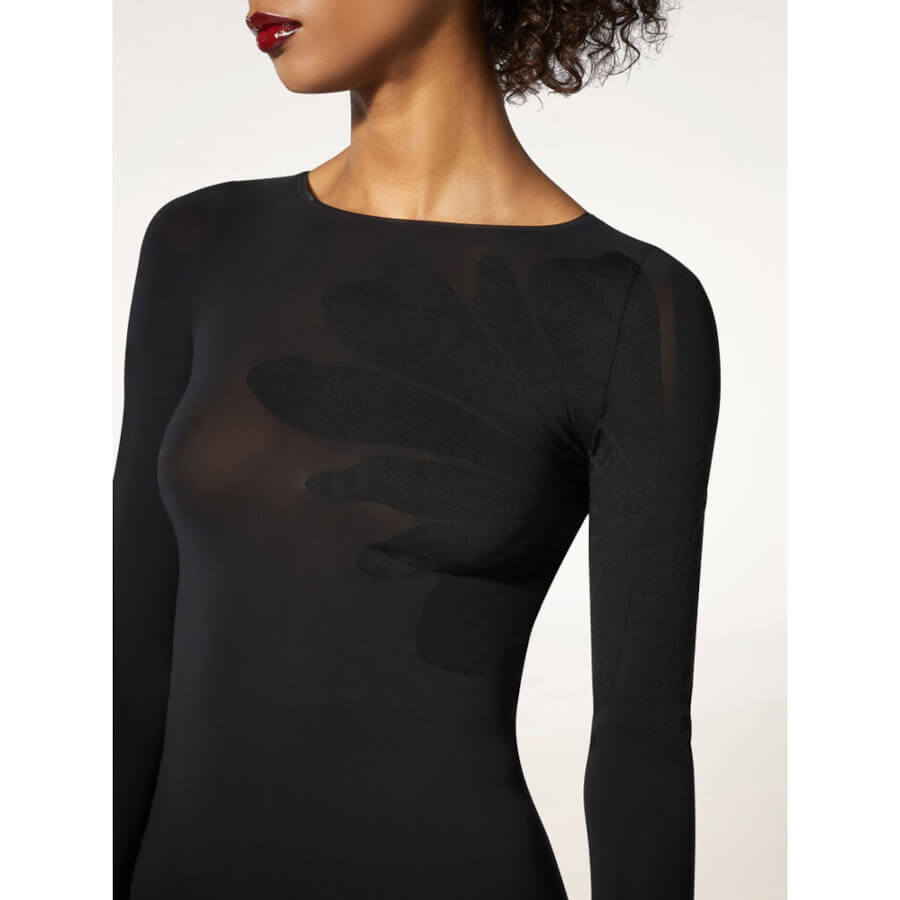 Wolford BODY TATTOO TOP LONG SLEEVES. Denne langærmede top i cirkulærstrik er fremhævet af et stort blomster-motiv på venstre side. Det transparente-opaque materiale smyger sig om kroppen, og toppen har en rund halsudskæring