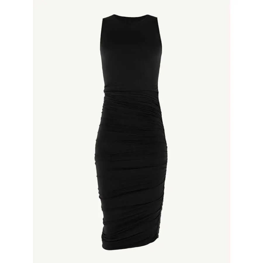 Draperet ærmeløs kjole fra Wolford, skabt med det ikoniske, sømløse Fatal tube-design. Kjolens bløde materiale falder asymmetrisk over kroppen og skaber et elegant, draperet udtryk. Den tætsiddende silhuet kombineres med volumen i draperingen og fuldendes af en rund halsudskæring og racerback-skulderdesign.