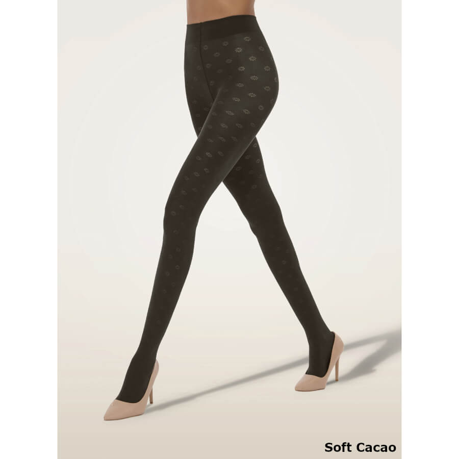 Wolford DAISY COTTON TIGHTS. Dynamisk design møder feminine blomster i disse sømløse strømpebukser – jacquardstrikket på specialmaskiner for at skabe et diskret margueritmønster, der står smukt i kontrast til den dækkende bund. De er fremstillet i en bomuldsblanding, farvet med bæredygtige farvestoffer, og afsluttet med en blød, indstrikket linning, som kombinerer hverdagskomfort med bevidst design.