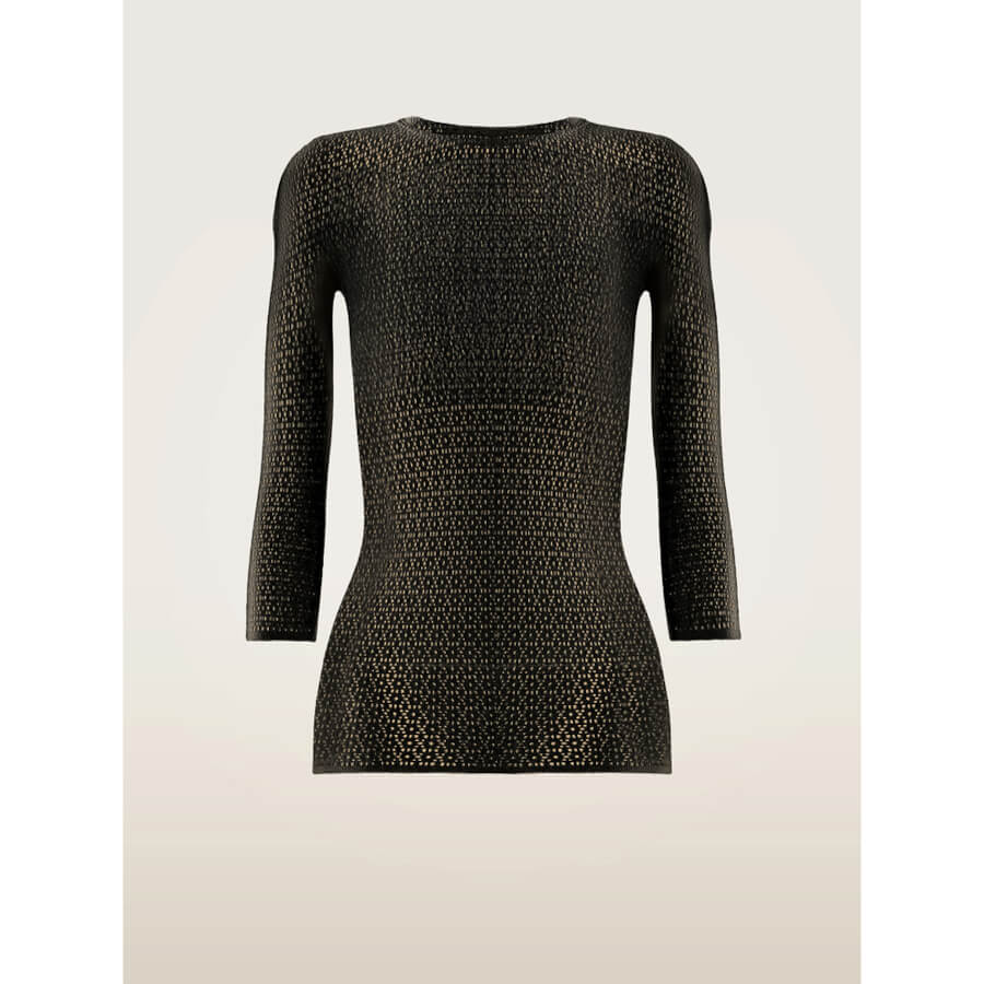 Geometrisk margueritmønster / Kædestrikket net / Meget fin og blød kvalitet / Strikket på en strømpe-maskine / Fremstillet af genanvendt ECONYL®-garn / Farvet med bæredygtige farvestoffer / Mat finish / Sømløs, strikket i ét stykke / Slim fit / Rund hals / Ærmer til albuen / Rå kanter