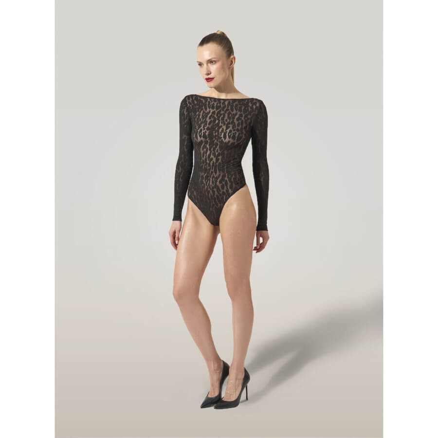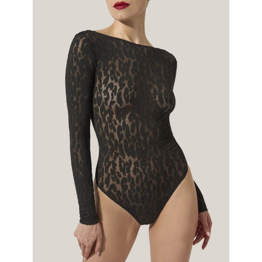 Denne fine Wolford bodystocking har lange ærmer og en rundhalsudskæring. Den er med g-string og knappeåbning ved skridtet. Bodystockingen er i et smukt og transparent leopardmønster.