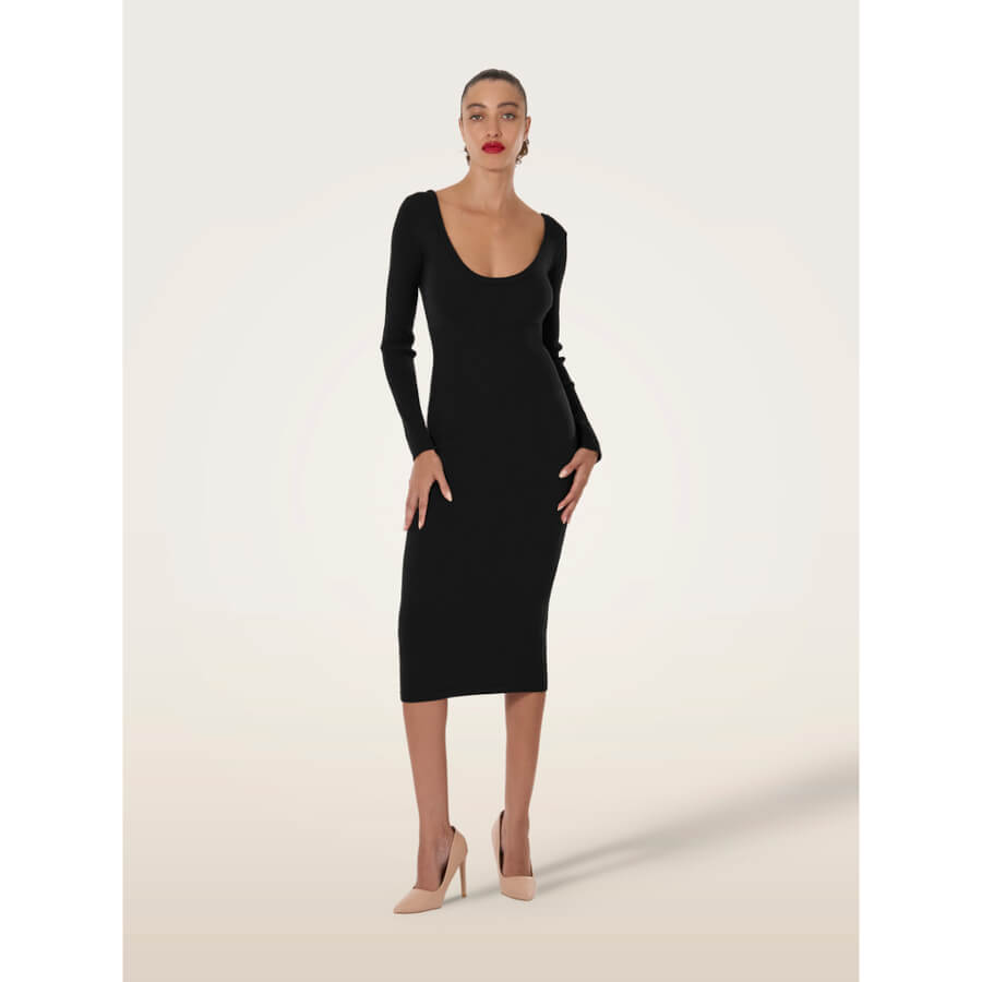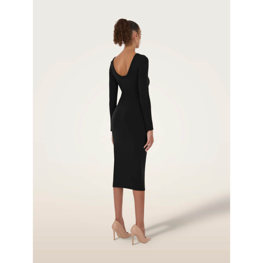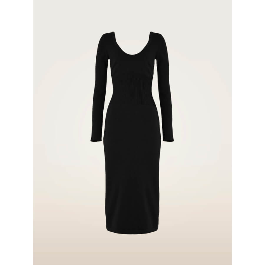 Wolford LUXE MERINO DRESS. Langærmet midi-kjole i merinould. Med en innovativ body-mapping-effekt er denne kjole både komfortabel og flatterende. Wolfords karakteristiske, strækbare merinould er strikket med en diskret kombination af teksturer, der fremhæver den tætsiddende pasform, mens den dybe, runde udskæring foran og den blødt afrundede udskæring bagpå sikrer et feminint udtryk fra alle vinkler.
