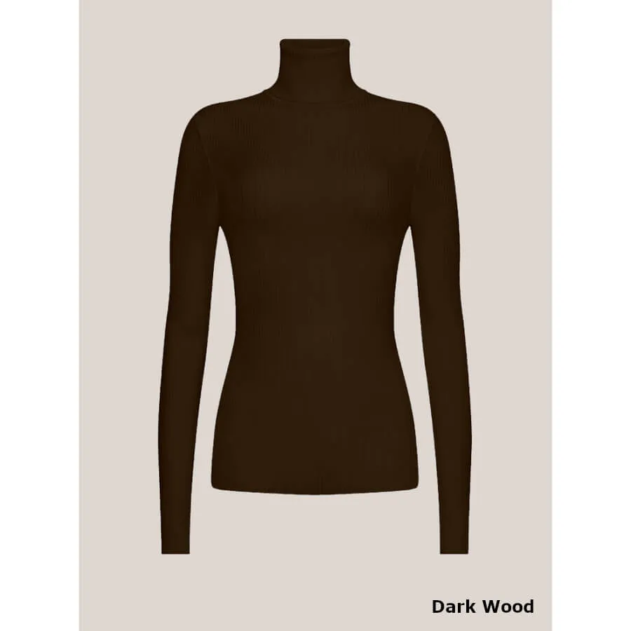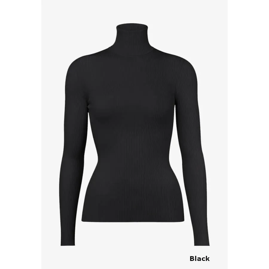 Wolford MERINO FINE RIB TOP LONG SLEEVES. Pullover med rullekrave lavet af fin, blød merinould. Det ribbede look og slim fit gør denne uld pullover til en tidløs klassiker. Kommer i farverne: sort, hvid og brun.