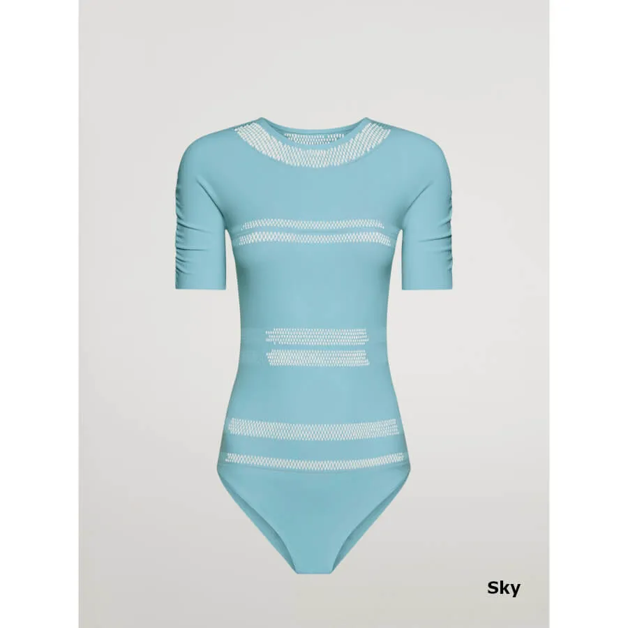 Wolford NET LINES BODY sky. Transparente netkanter fremhæver den warp-strikkede bodysuit og skaber en skarp definition af silhuetten. Den enkle, runde halsudskæring og de korte, sammenskrænkede ærmer fuldender det elegante look. Det strikkede W-logo fremhæver den strækbare, sømløse bodysuit, der er fremstillet af hurtigtørrende, genanvendt garn.
