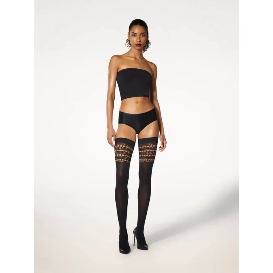 Wolford PUNCH STAY-UP. Stay-ups med perforeret design. Det matte, uigennemsigtige materiale i disse stay-ups er brudt af et perforeret design, der omslutter de øvre lår. Silikone elastikbånd holder dem sikkert på plads. 50 den
