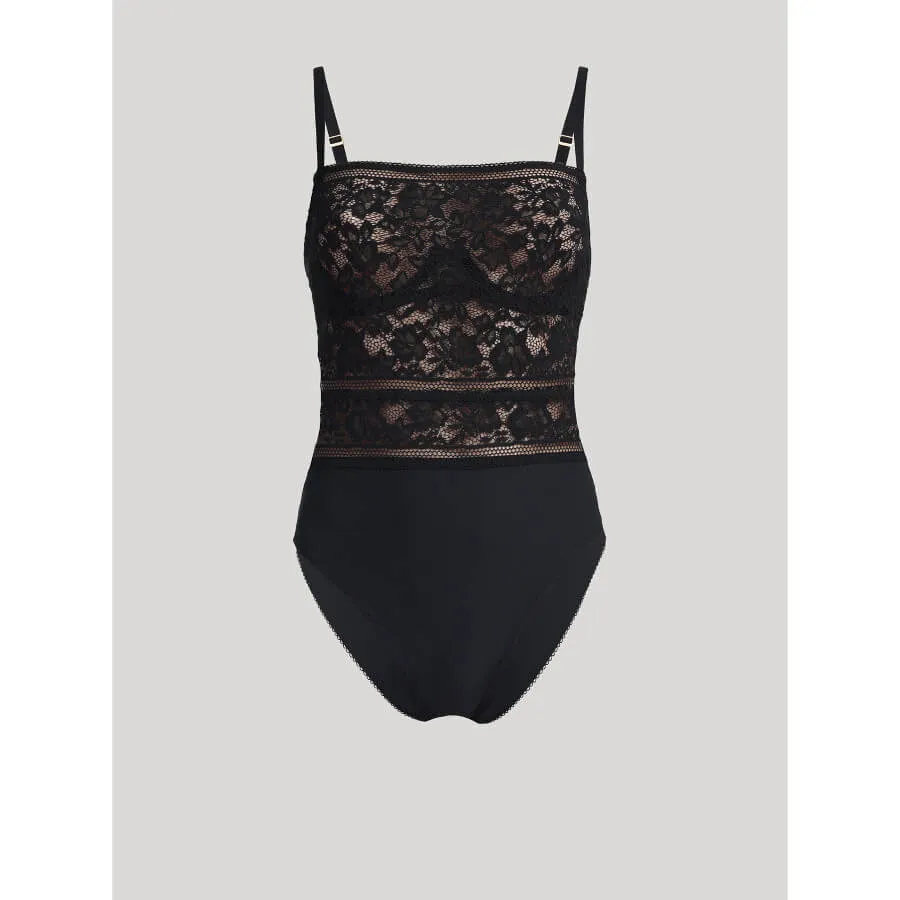 Wolford STRAIGHT LACED SHAPING BODYSUIT black. Elegant og moderne, denne bodysuit kombinerer sødme og kant med en blomstret Galloon-strækblonde og geometriske detaljer. Det rette udskæringsdesign med indbygget bøjle tilbyder både komfort og støtte, mens shaping-mikrofiberen fra taljen og ned skaber en stærk og flatterende silhuet.