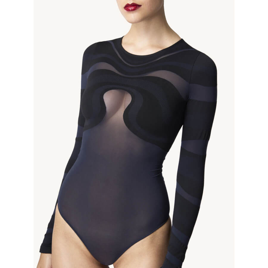 VENUS STRING BODY. Hvirvlende linjer fremhæver brystet og armene i kontrast til resten af den transparente bodystocking. Den tofarvede, matte cirkularstrik omfavner hver kurve. Denne langærmede bodystocking har en string-bund og en rund halsudskæring.