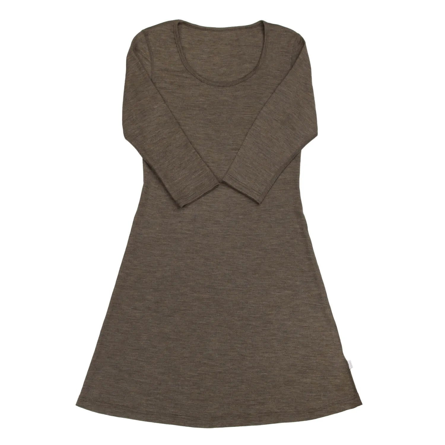 Kjole med 3/4 ærmer i A-facon. En ekstra fin uld kvalitet med silke. Virkelig blød og glat kvalitet med god strækevne som er dejlig behagelig at have på. Meleret stof. Wool rich blend og Oeko-tex 100 mærket.