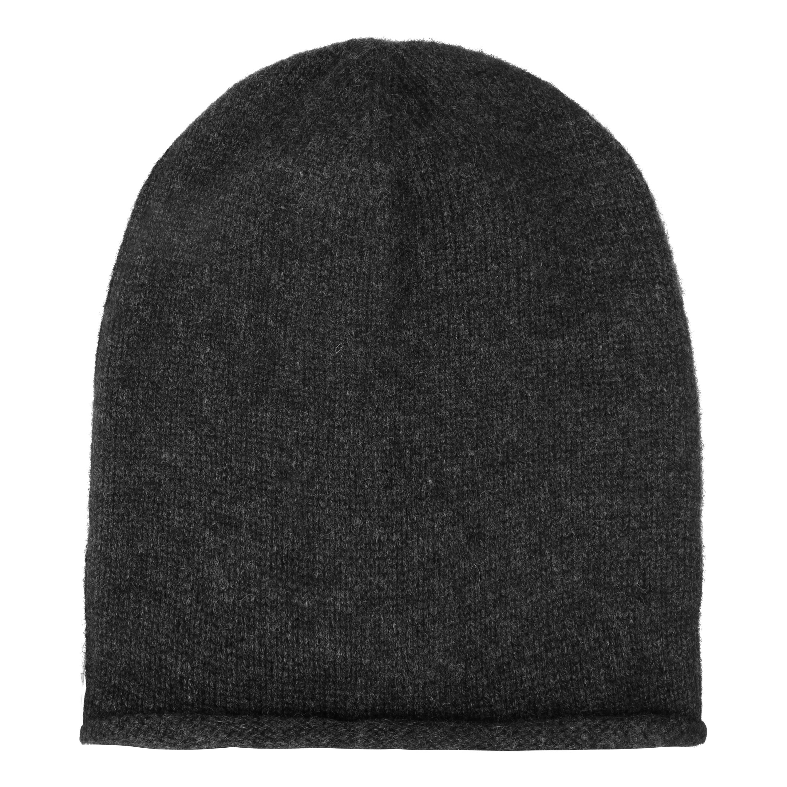 Dejlig, varm og blød cashmere hue i glat strik. Grå-sort.
