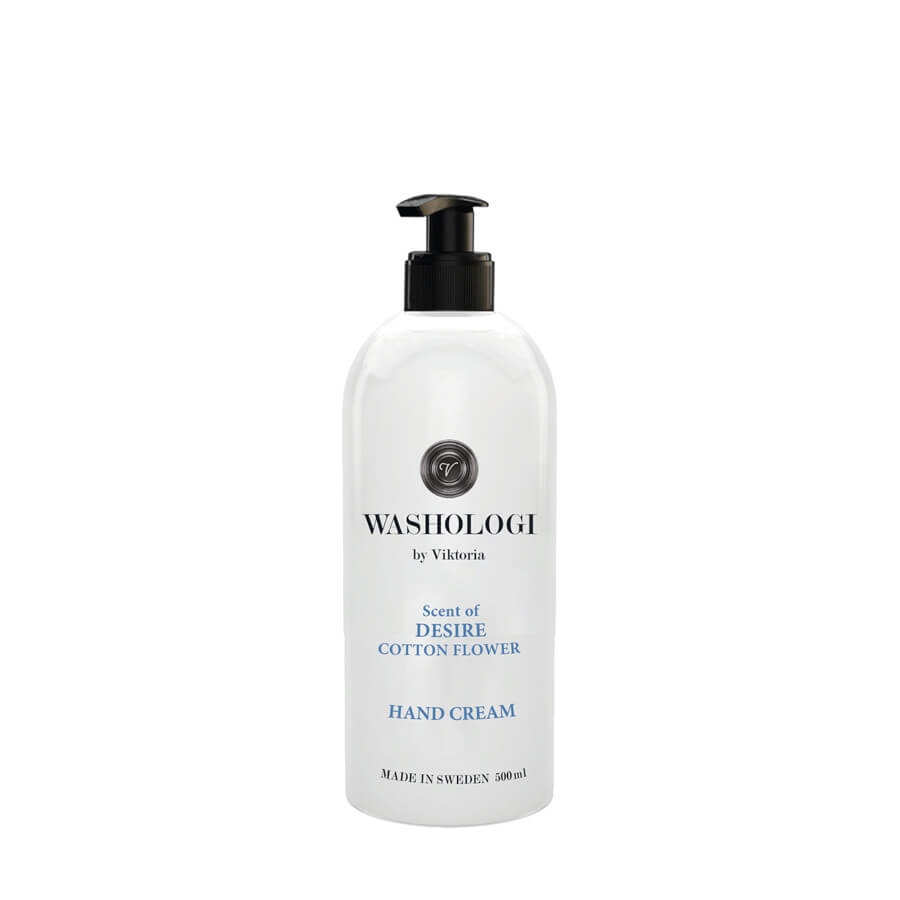 WASHOLOGI Hand Cream Desire – 500ml. Håndcremen er ikke-fedtet og indeholder nærende aloe vera, der fugter og forhindrer tørre hænder. Håndcremen er biologisk nedbrydelig og fri for farvestoffer.