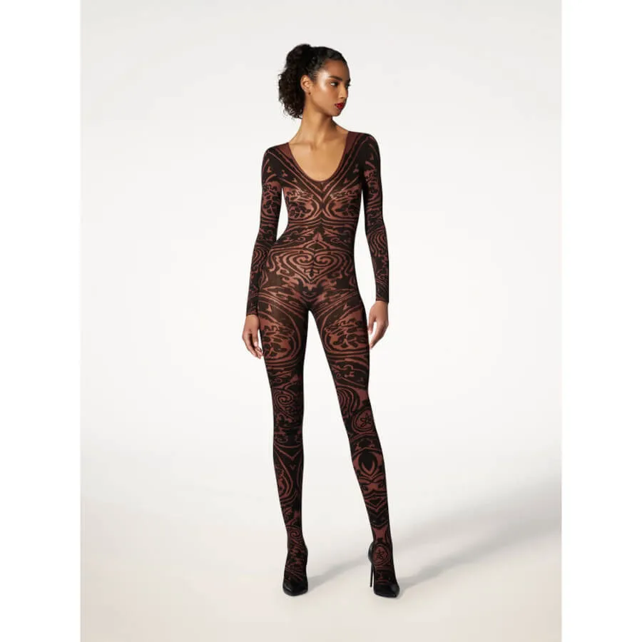 Wolford BODY TATTOO CATSUIT. Den rundstrikkede catsuit pryder arme, krop og ben med iøjnefaldende motiver. Det uigennemsigtige mønster står i skarp kontrast til den gennemsigtige baggrund og skaber et kantet, tatoveringsinspireret look.