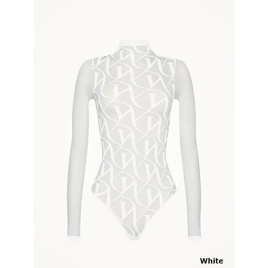 Wolford W LACE STRING BODY. Mønstret bodysuit: Et detaljeret, geometrisk design med W-logoet, der er indlejret i den gennemsigtige cirkulære strikbodysuit. Blandingen af motiver kombineres med en elegant, mat finish. Bæredygtigt farvet, bodyen har lange, gennemsigtige ærmer og en bomuldsfold med trykknapper.
